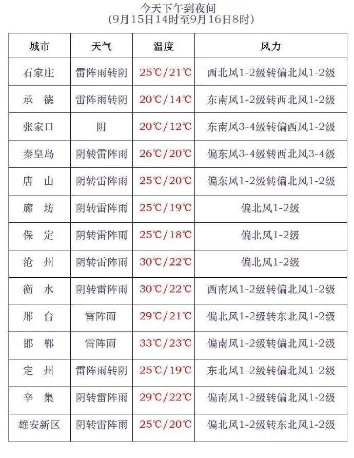 今天下午到夜间,全省阴,大部分地区有雷阵雨或阵雨,雷雨时局地伴有短时大风等强对流天气,其中承德、沧州、衡水、邢台东部、邯郸东部局地有中雨。