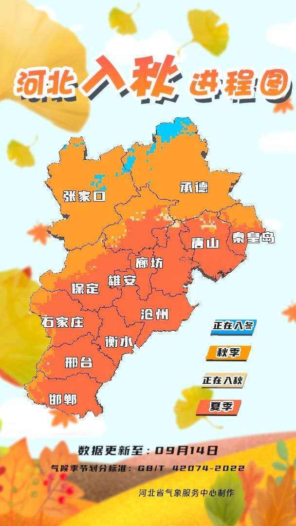 截至14日,河北省北部和西部山区大部均已进入气象意义上的秋季,其中张家口、承德两个地区的局地还在尝试入冬,其他地区则仍在夏季或正在入秋中。