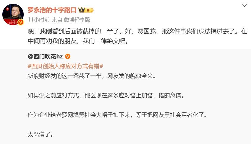 14日深夜,罗永浩发文博表示:“贾国龙,那这件事我们没法揭过去了。在中间再劝我的朋友,我们一律绝交吧。”
