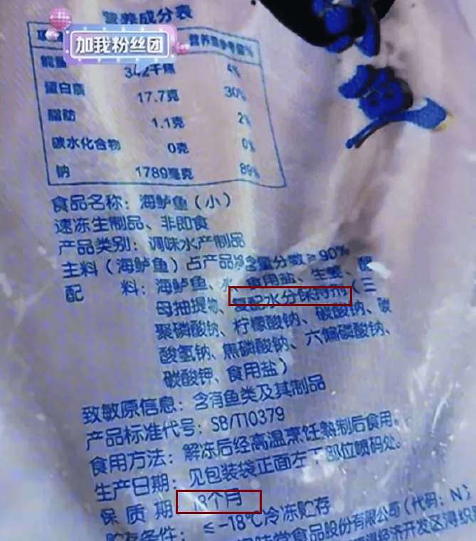他以媒体拍到的一款西贝后厨使用的海鲈鱼为例,展示了其包装配料表,可以看到,上面写着含有三聚磷酸钠、六偏磷酸钠等多种复配水分保持剂,保质期长达18个月。