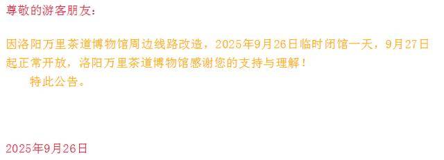 9月26日,记者从洛阳隋唐大运河文化博物馆获悉,因洛阳万里茶道博物馆周边线路改造,2025年9月26日临时闭馆一天,9月27日起正常开放。