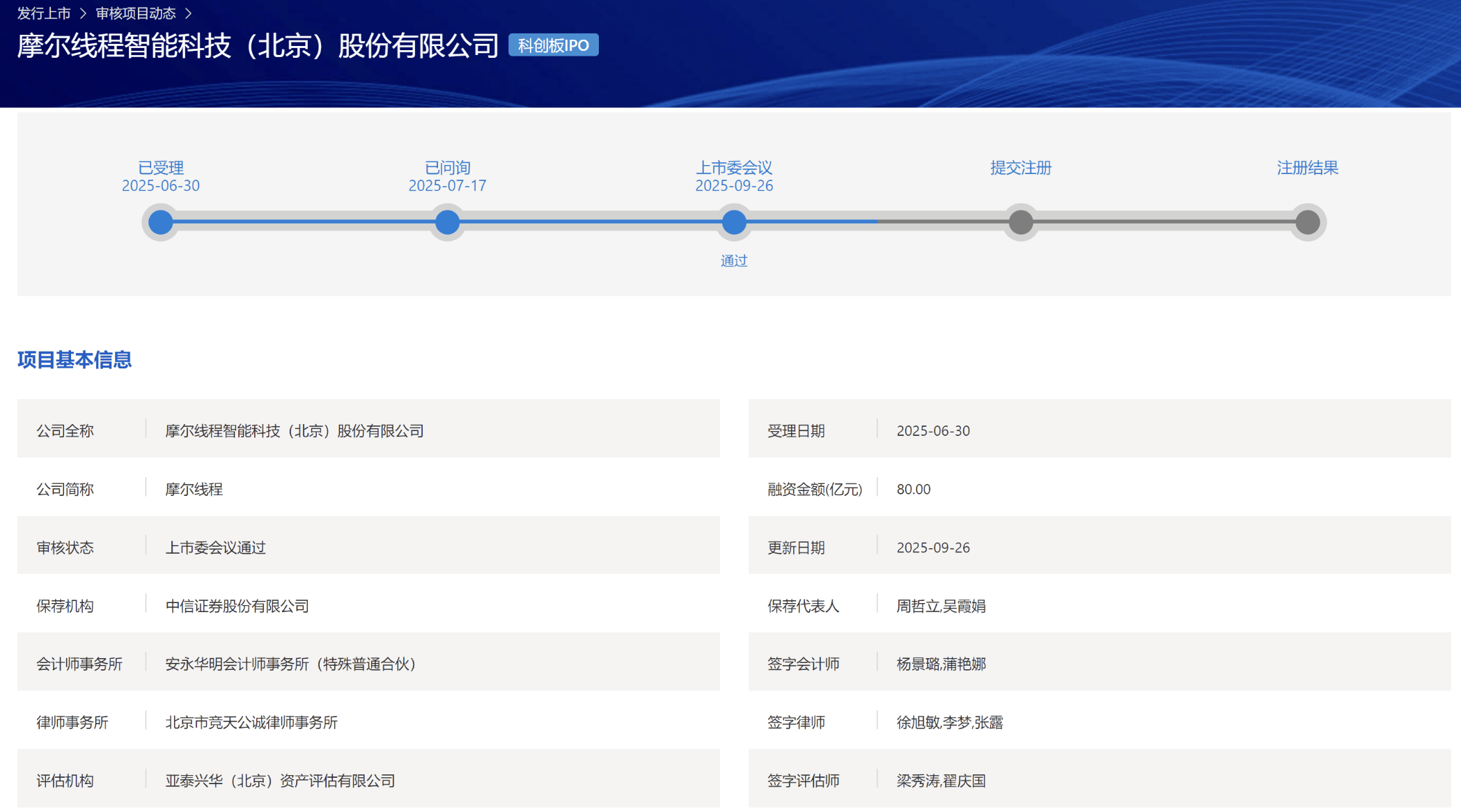 上交所官网显示,9月26日,摩尔线程智能科技(北京)股份有限公司首发申请成功通过上交所上市审核委员会会议审议。这距离其IPO(首次公开招募)被受理仅仅88天,可以说“光速”过会。