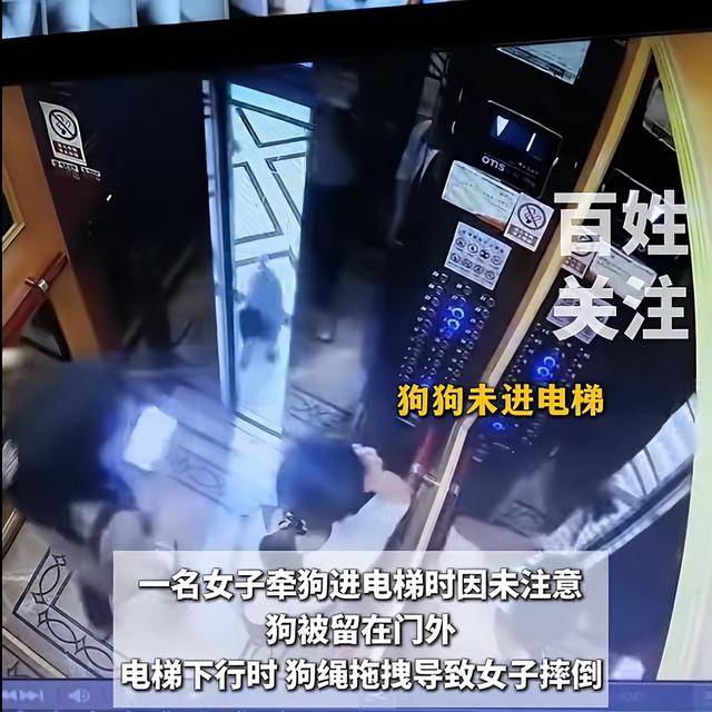 9月27日,四川遂宁,一女子牵狗乘坐电梯时,未注意到狗没进电梯,电梯下行瞬间狗绳拖拽导致女子摔倒。