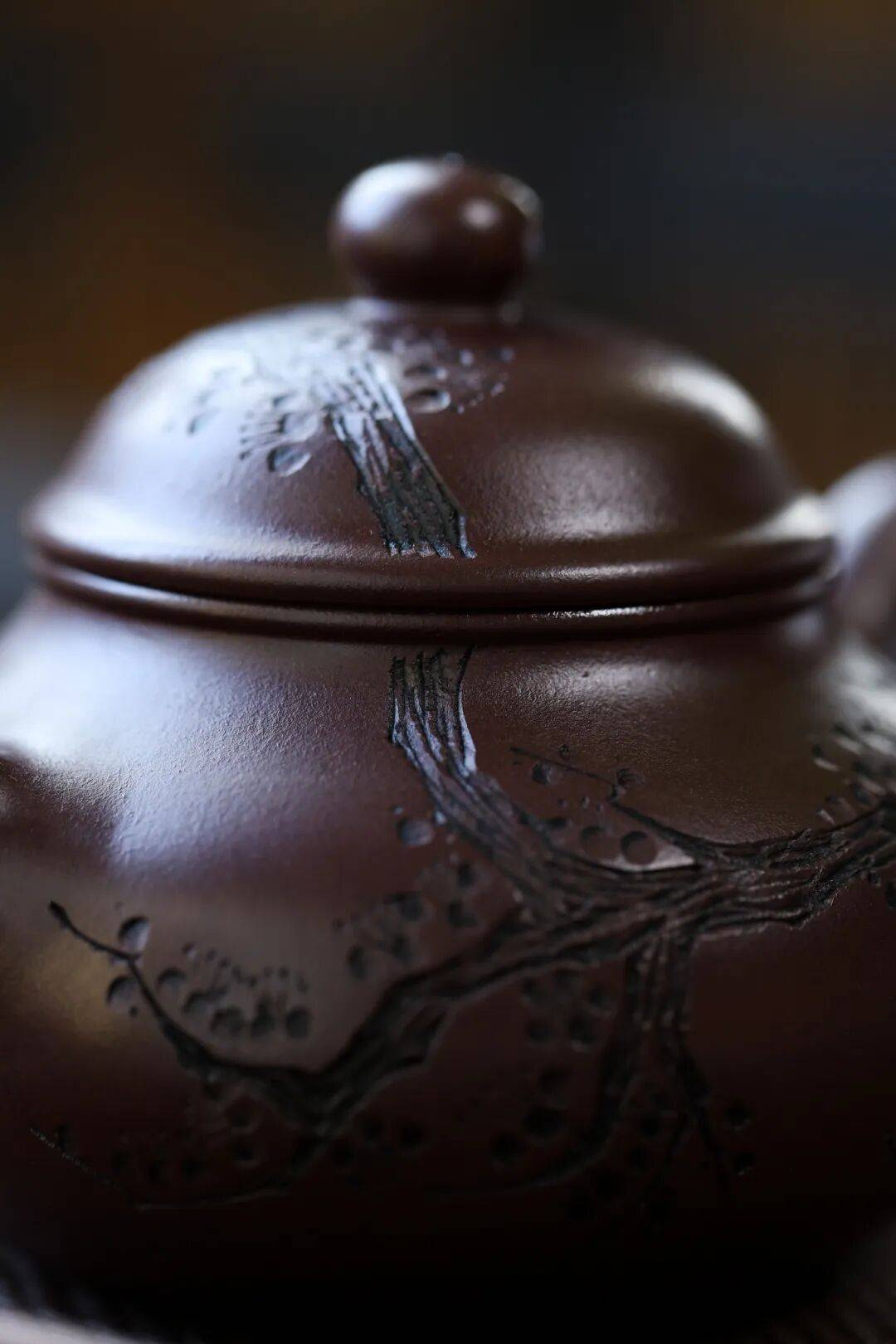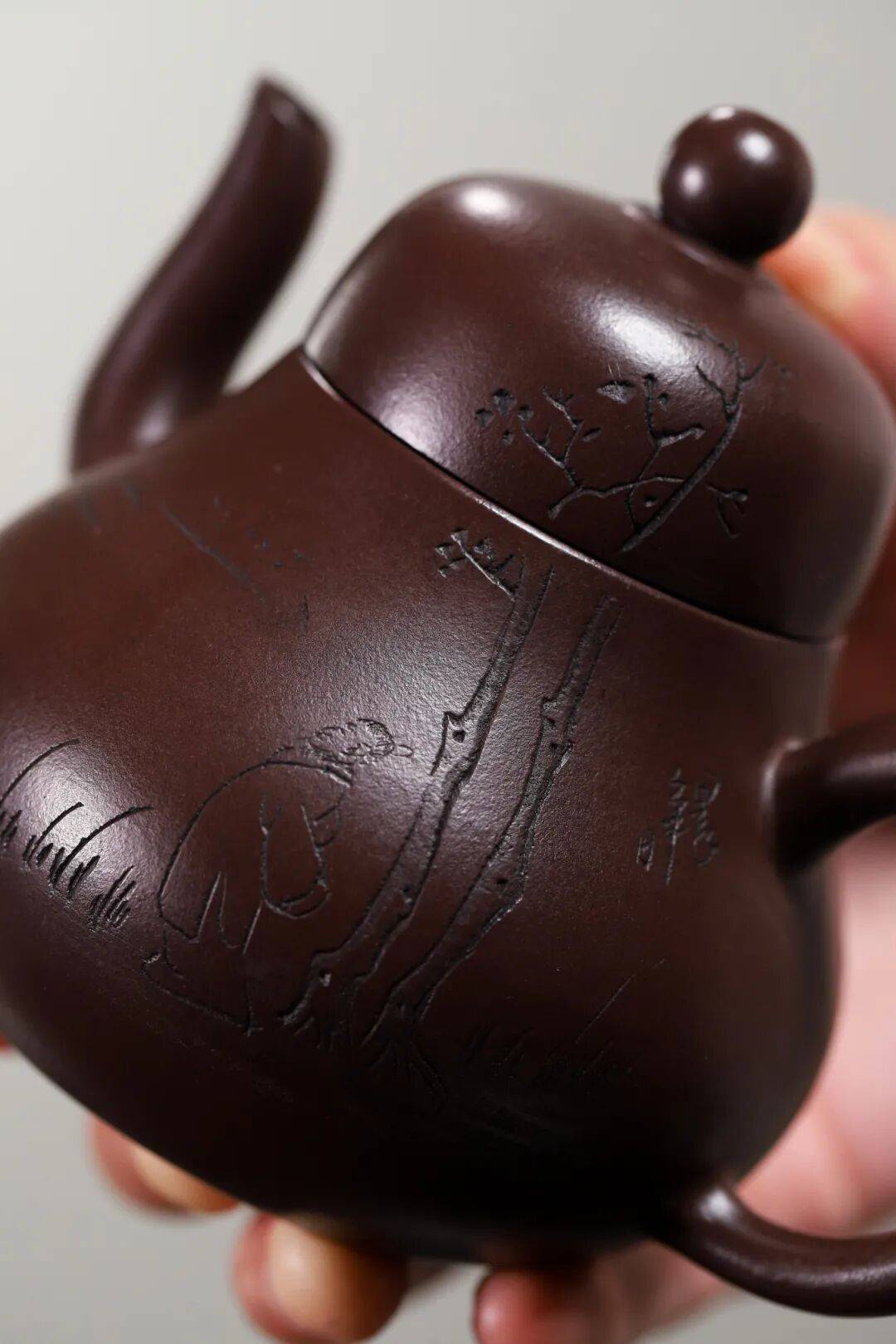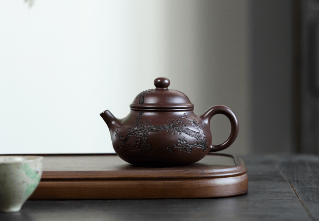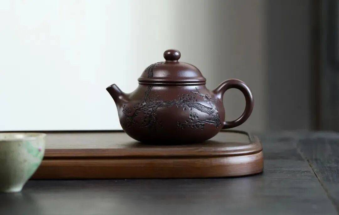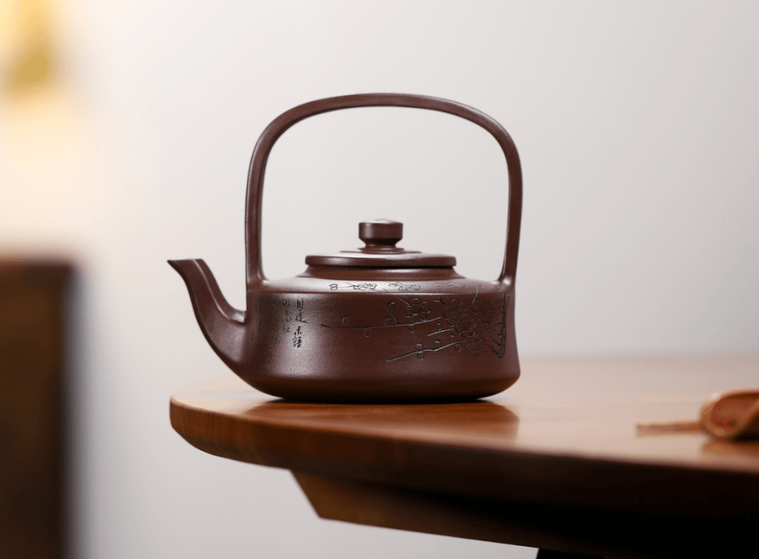 壶身侧刻一簇怒放梅花,枝干延伸至壶盖,形成“绕壶看花”之趣。报春元素则让整器在沉稳中透出盎然生意。