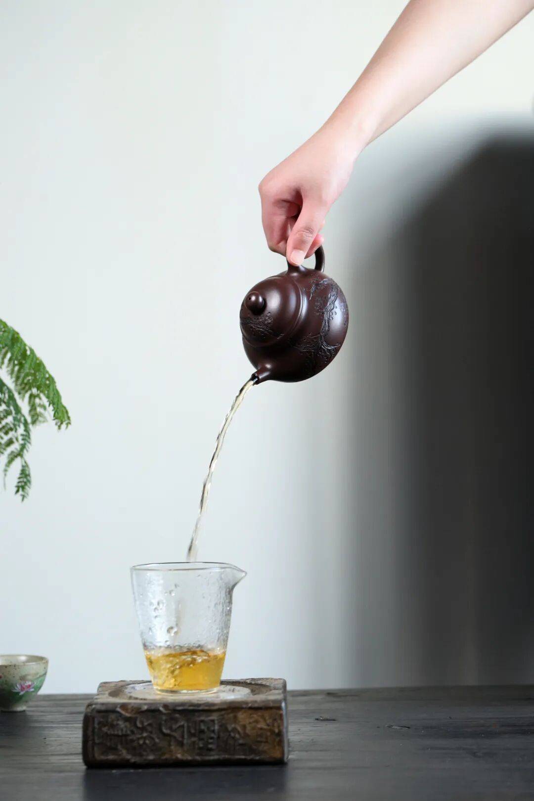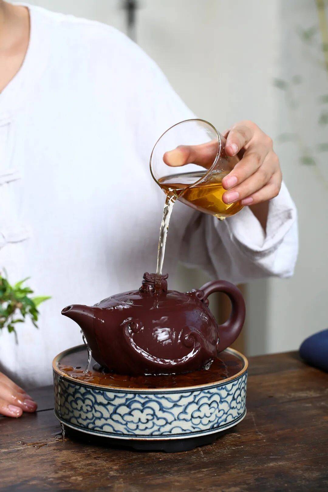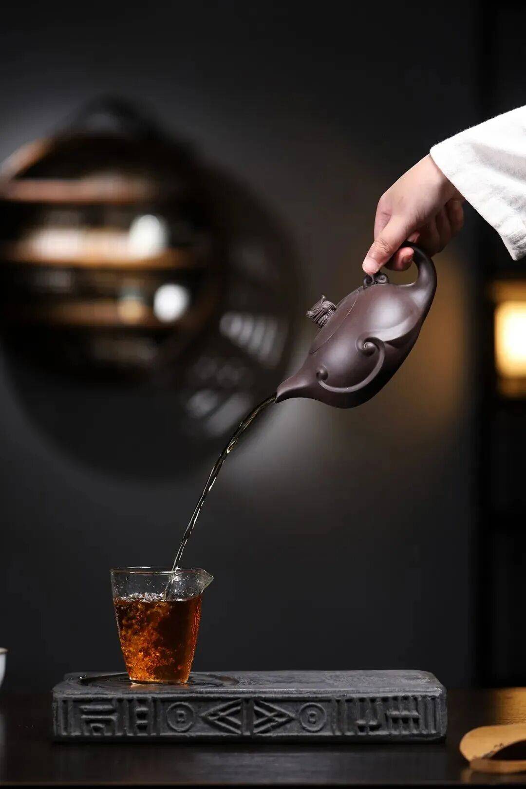 潮声在壶腹暗生;指间轻捻,仿佛东海随指环而旋,万顷银涛尽收于寸许紫砂。