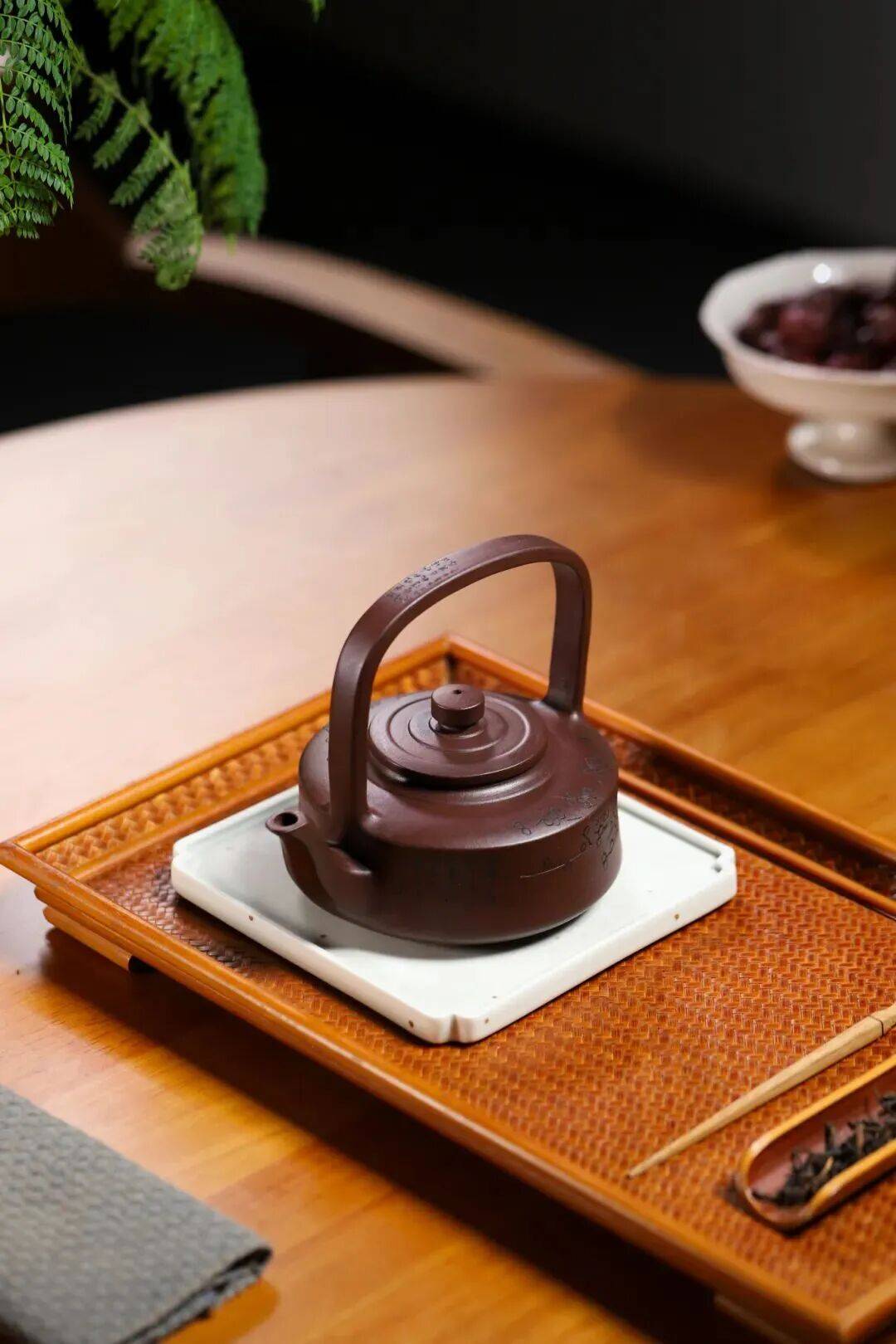相传苏东坡谪居宜兴蜀山,嫌侧把烫手,"以藤系梁"煮茶,留下"东坡提梁"的雏形。