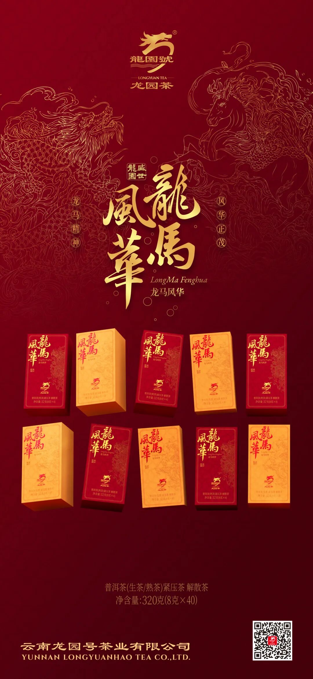 【龙马风华】普洱茶系龙园号新推出的一款十年陈普洱生熟套装礼茶。采用中华民族传统“龙腾马跃”元素为设计理念。「龙马」取自《周易》「河出图,洛出书,圣人则之」之神兽,象征天地精神与祥瑞之气;「风华」既喻茶叶历经岁月淬炼仍葆华彩,亦暗合「风华正茂」的生命力。此名尽显茶品雍容气度与陈化潜力,寓示品饮者如龙跃云津、骏驰寰宇。