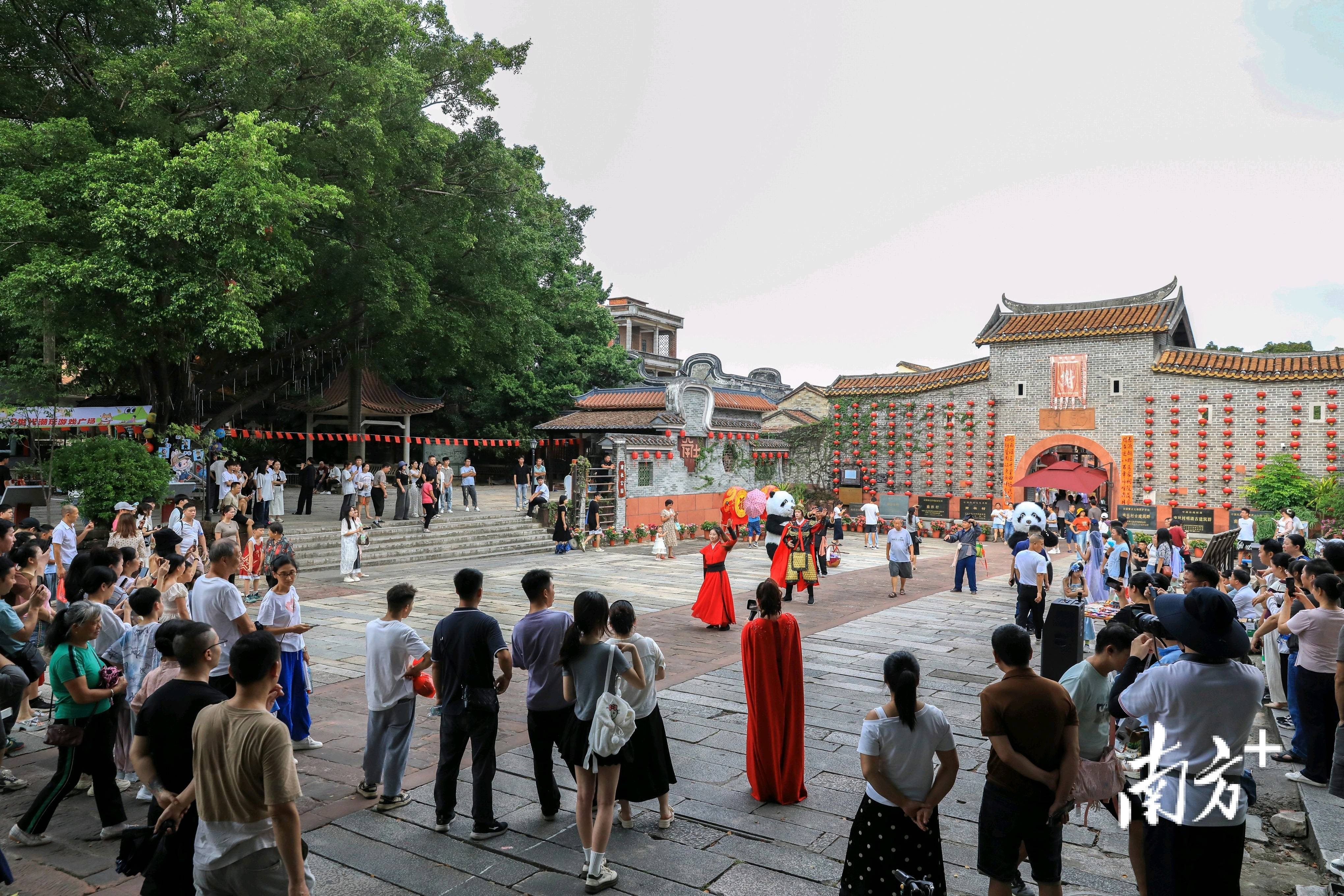今年南社古村增加了多个NPC互动活动,让游客实现从“看”到“玩”的转变。此外还有农耕巡游、粤剧表演、灯光秀、夜间实景演出等,10月1日至7日期间每天超20场特色活动轮番上演,从传统民俗展演到新潮互动全覆盖,让游客沉浸式体验古村的“古今穿越感”。