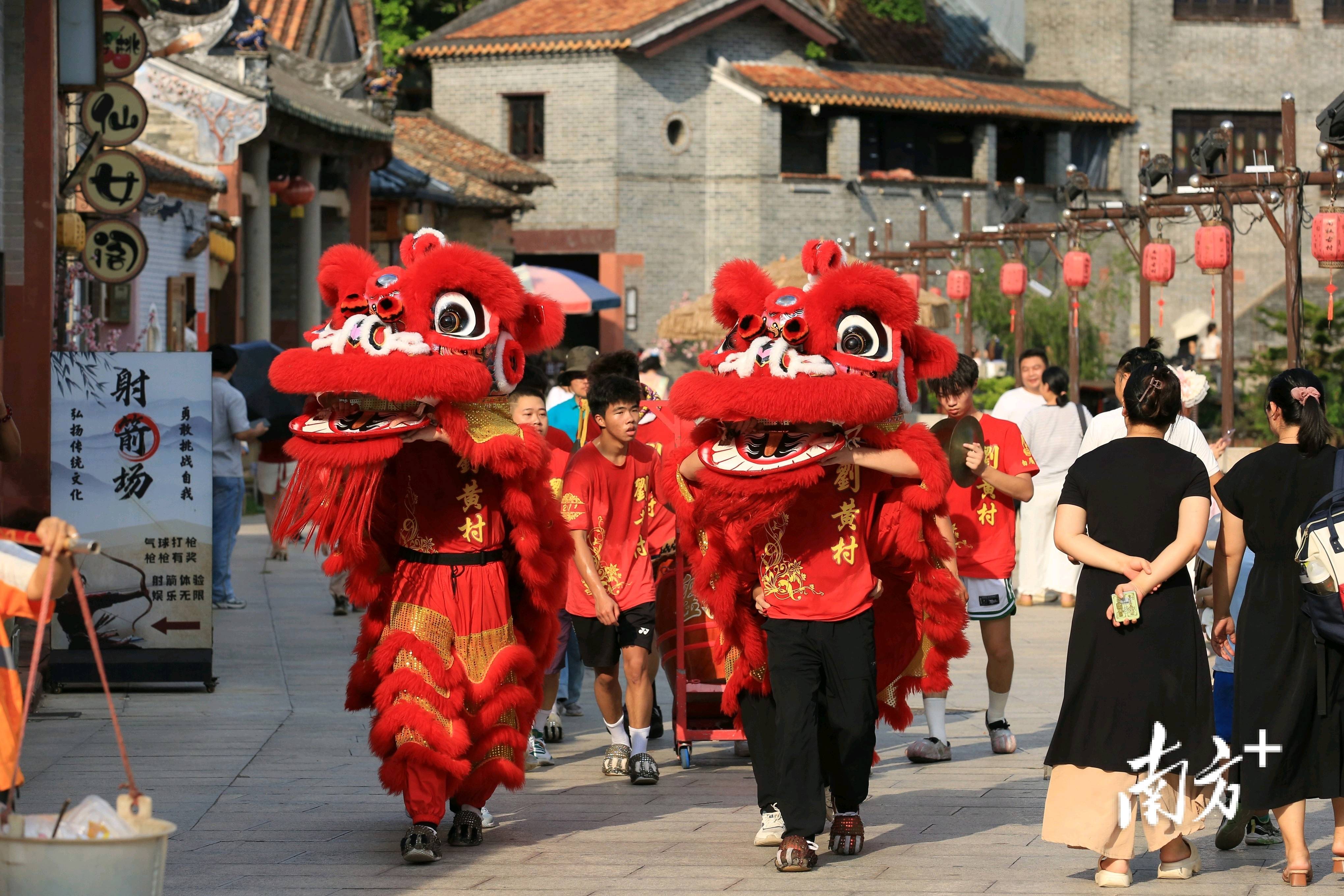 走进古村,随着锣鼓声响起,大批游客闻声赶来。彩狮随鼓点精准起落、眨眼、摆尾,将醒狮神韵演绎得淋漓尽致,高难度的叠桩跳跃更是让游客喝彩不断。