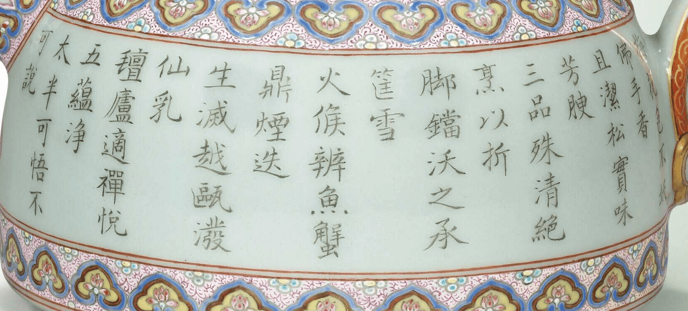 清乾隆 洋彩粉青地御题三清茶诗茶壶