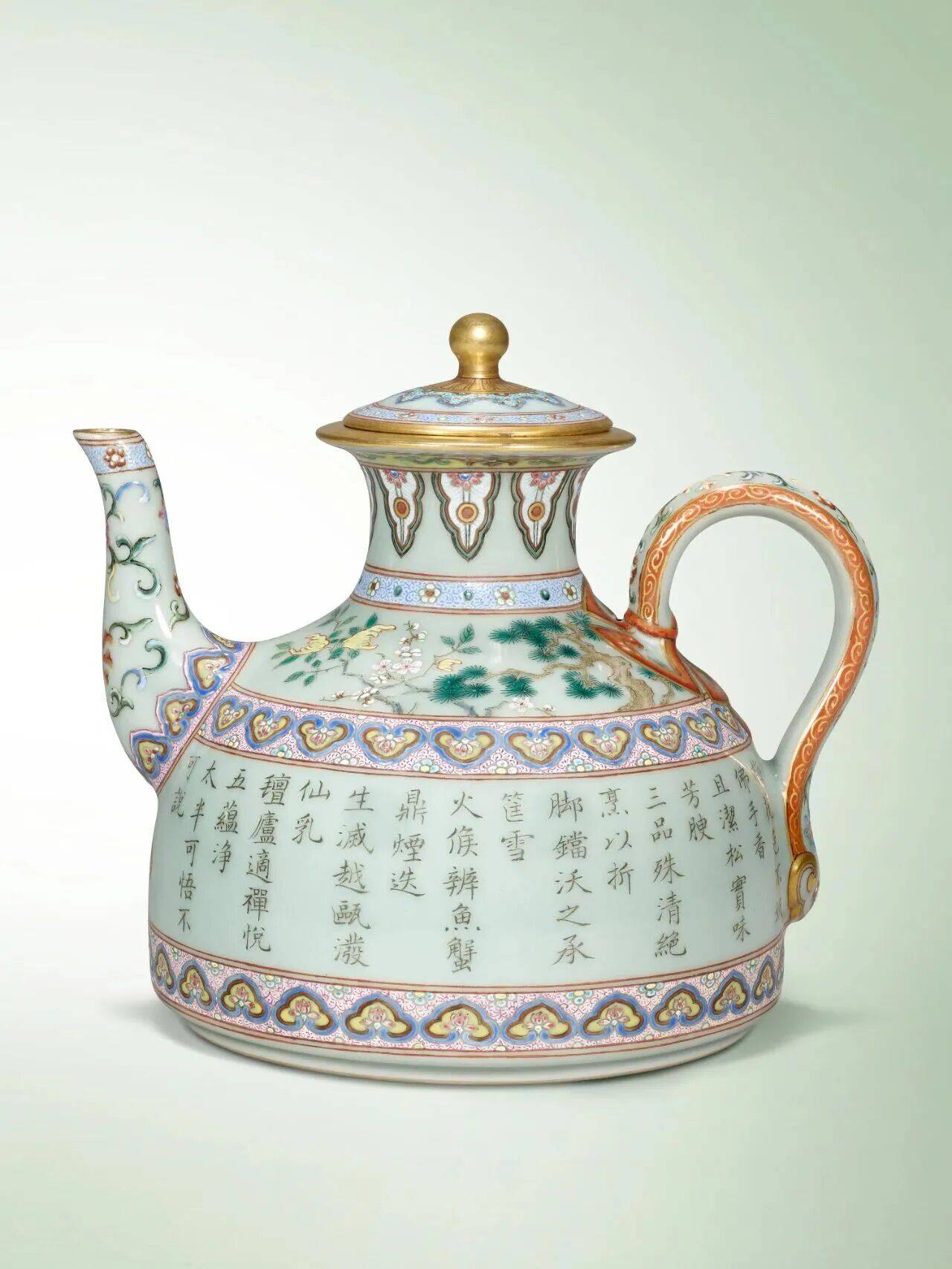 乾隆年间的清晨,御书房外薄雾未散,案上一盏粉青釉茶壶已盛着温热的三清茶。茶烟袅袅中,皇帝提笔在壶身题诗,那些关于茶事的闲逸文字,随着釉色的温润,被永远定格在瓷土之上。如今,这只清乾隆洋彩粉青地御题三清茶诗茶壶,即将于 2025 年 10 月 30 日在佳士得 “爱莲堂珍藏 - 御用文房雅制” 专场亮相,带着三百年的茶香,与收藏爱好者重逢。