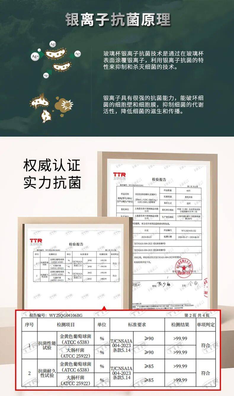 银离子抗菌玻璃杯壁,对大肠杆菌、金黄色葡萄球菌的抗菌率高99.99%。清洗更省心,饮用更踏实,健康守护看不见却时时存在。