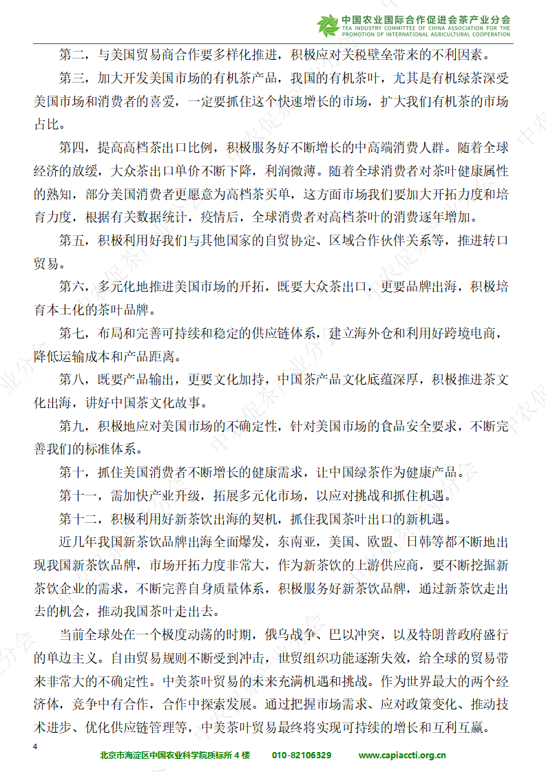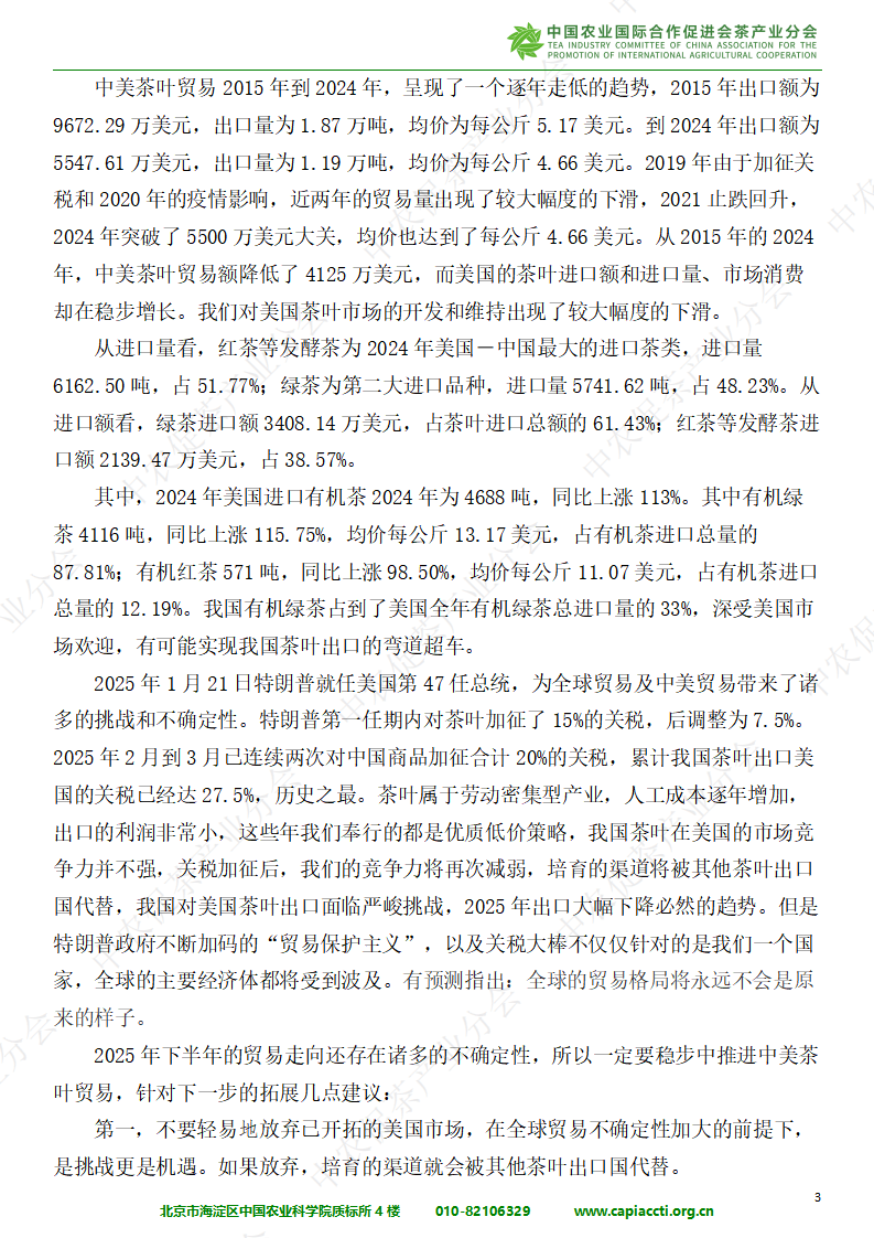 展望未来,美国茶叶市场虽存在贸易政策变动等不确定性,但整体消费增长趋势明确,高品质、健康化、多元化成为发展方向。对于中国茶企而言,应充分把握有机茶、高端绿茶等细分市场机遇,优化产品结构,提升产品品质,同时加强对美国市场法规和消费习惯的研究,通过与当地贸易商合作、布局跨境电商等方式,进一步巩固和扩大在美国市场的份额,推动中国茶叶在全球高端市场的影响力持续提升。