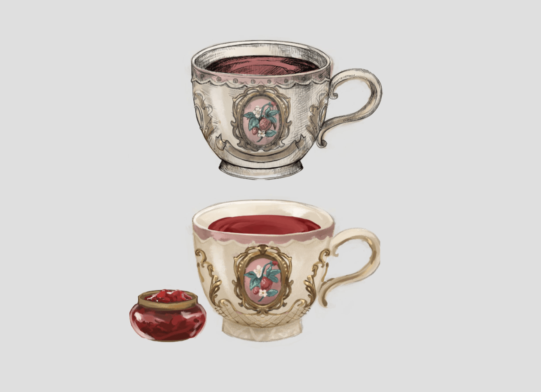一个示例:我先提供茶饮名称和茶的种类,即“仙后”和莓果茶,然后由 L 绘制两个版本,让我二选一。因为针管笔风格的描线相对耗时,我还是选了下面的版本作为卡面素材