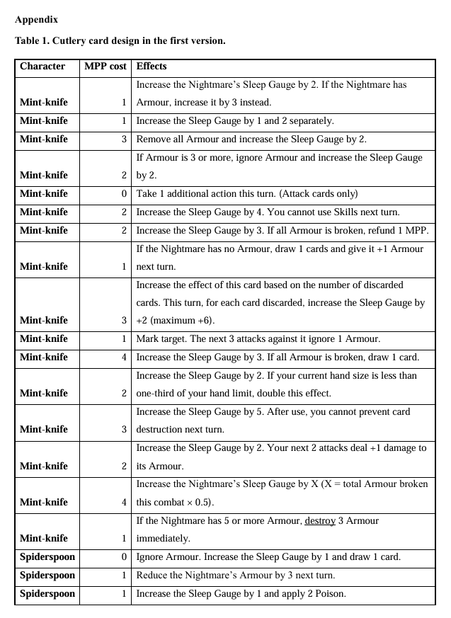 最终,依照上述思路,我们给角色们填充了相应的血量、手牌上限、抽牌性能、费用等必要参数,给 3 位餐具精灵各自装上了 15 张各异的卡牌。本来她们还各有 8 个左右可选的初始遗物,但被我以量太大,增加测试压力、规则讲解压力、玩家读牌和理解压力而无情否决了。噩梦的机制较为简单粗暴,所以其卡牌种类只有 11 种,不过很快,我们就根据强度不同,为每一种牌配置了对应的张数,组成一套测试可用的卡组。