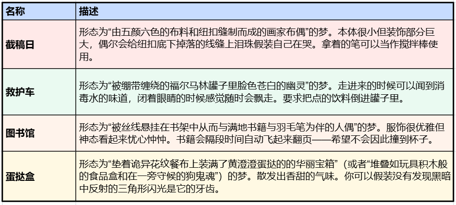 当时尚且比较稚嫩的噩梦设计文案。基本上是基于生活中会发生的各种切实影响入睡的困难——画师的截稿压力、心率过速随时会猝死的感觉、临考前的紧张备战、吃太撑了导致消化不良——做的艺术化处理,此项目中实际推进的噩梦形象为其中的“截稿日”