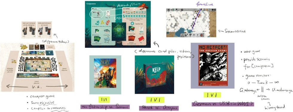 游戏调研部分的资源主要来源于我的过往游戏经历、桌面搜索(毕竟是海外硕士论文,一般从 Youtube、BoardGameGeek 和 Reddit 上找会比较方便,可以直接引用)、以及桌游经验丰富的朋友推荐。设下非对称、对抗、卡牌的关键词后,我选取的游戏范例包括:《茂林源记》(Root)、《藻影追猎》(Kelp)、《魔戒:中土对决》(The Lord of the Rings: Duel for Middle-earth)、《兵棋,永不退缩》(No retreat!)、《米勒山谷狼人》(The Werewolves of Miller's Hollow,海外版狼人杀)、《古墓迷踪》(Pyramid of Pengqueen,直译即“木乃伊的诅咒”,是一款用到磁铁的对抗寻宝桌游)。