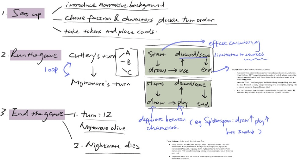 相关时间线依然可以追溯到两年以前。本部分的要点是体验先行,提供足够的可拓展性,以及玩法和叙事融洽。核心体验的设计正如副标题所言,包括拆牌换牌的物理交互、紧张的倒计时回合追赶,以及迷你妖精餐具与巨大噩梦之间的非对称博弈。