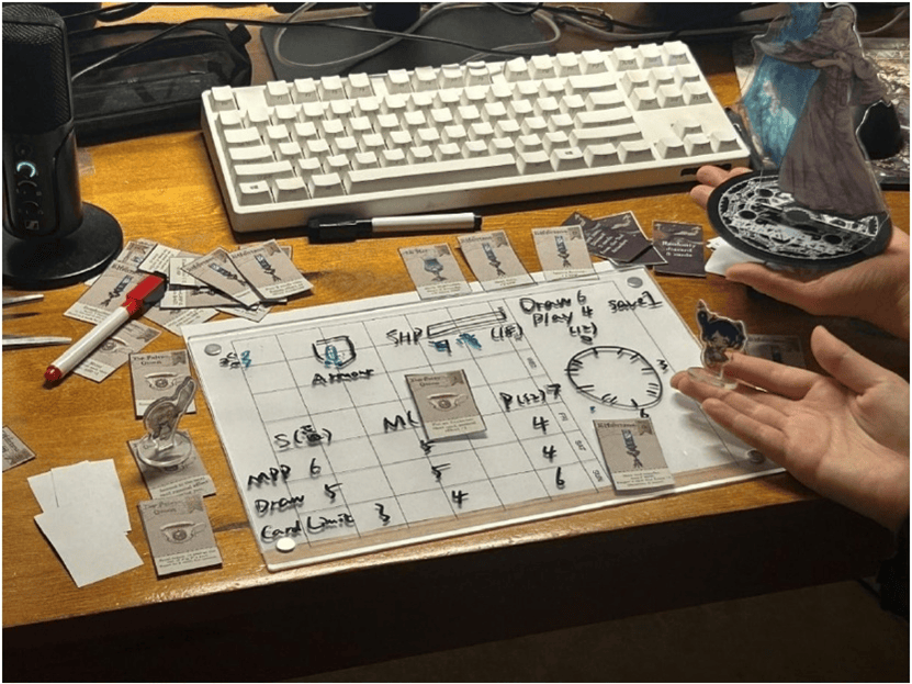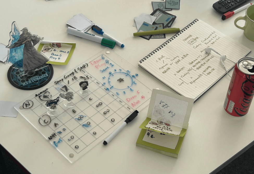 第一轮测试发生于欧中时区 5 月 7 日下午 14:00 至 18:00,地点是校内教学楼(当时隔壁 Prototype 课程正举行 Game Hub 活动,正好提供了互相试玩的场所)。除我以外,一共邀请了 4 位同学进行了 4 轮游戏。他们基本认可游戏框架,并对游戏节奏和实体卡牌的交互比较满意。不过,测试过程中很明显感觉到未经打磨的数值很影响游戏体验。