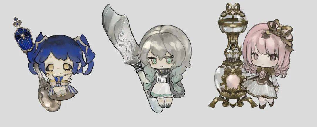 由 L 绘制的 3 个餐具精灵立绘,相应的中文命名是蜘蛛勺、薄荷餐刀和粉红皇后胡椒瓶