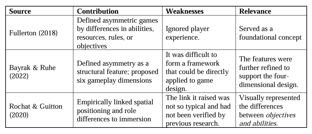 而关于学界对“非对称游戏”的研究,虽然总体数量算不上多,但提出的框架都比较实际,可用性都比较强。一些研究尝试探索非对称性的由来,比如将非对称性细分为“能力、资源、规则、目标”的差异与对立,从“行动、位置、时间框架、相互依赖性、结果和反馈”探索机制维度上的非对称性,以及玩家个体差异(例如技术水平和角色认同)与不对称体验的关联之类。还有一项研究专注于探索物理上的空间不对称性如何影响玩家体验(主要是满意度和沉浸感)。