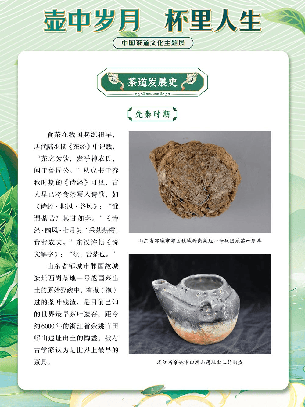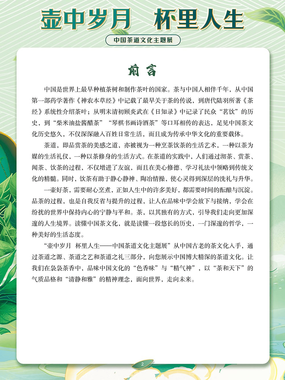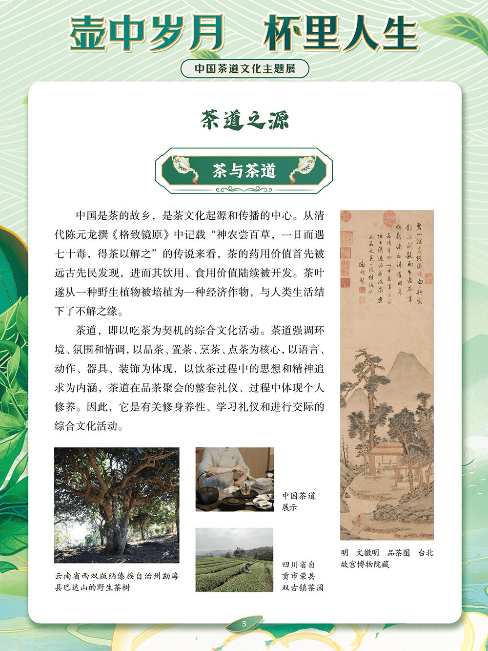 茶道,即品赏茶的美感之道,亦被视为一种烹茶饮茶的生活艺术,一种以茶为媒的生活礼仪,一种以茶修身的生活方式。在茶道的实践中,人们通过沏茶、赏茶、闻茶、饮茶的过程,不仅增进了友谊,而且在美心修德、学习礼法中领略到传统文化的精髓。同时,饮茶有助于静心静神、陶冶情操,使心灵得到深层的洗礼与升华。“壶中岁月 杯里人生——中国茶道文化主题展”从中国古老的茶文化入手,通过茶道之源、茶道之艺和茶道之礼三部分,向您展示中国博大精深的茶道文化。让我们在袅袅茶香中,品味中国文化的“色香味”与“精气神”,以“茶和天下”的气质品格和“清静和雅”的精神理念,面向世界,走向未来。