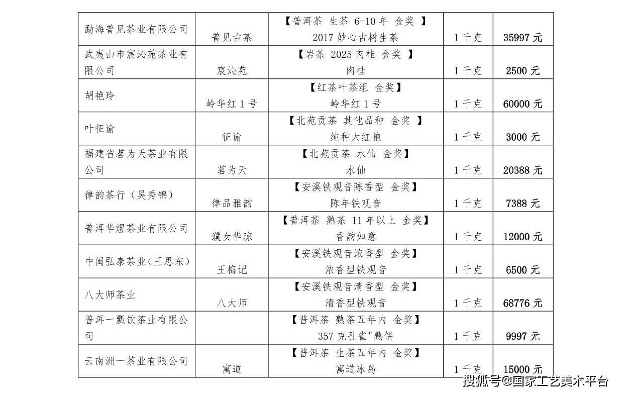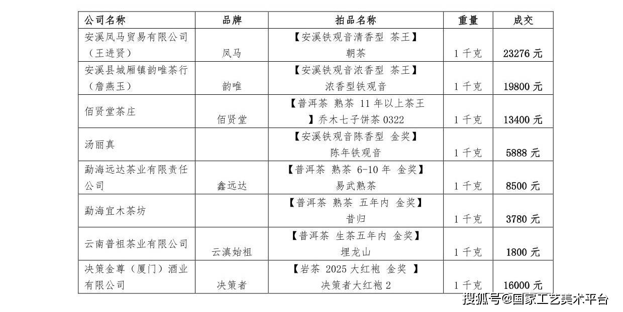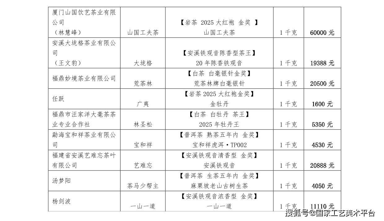 从行业发展维度看,本次拍卖的成功举办,进一步夯实了核心茶产区的“价值标杆”地位。通过“全国赛事筛选+权威平台拍卖”模式,优质茶叶的核心品质与背后的文化底蕴获得更广泛市场认可,既为消费者提供可追溯、高品质的茶品选择,更向全行业传递“品质决定价值、文化赋能品牌”的发展信号,为茶产业产业链升级、品牌化转型注入强劲动能,助力中国茶产业在高质量发展赛道上加速前行。现对本次拍卖中的部分企业名称、品牌/个体制茶人、茶品、重量及成交价予以公示。