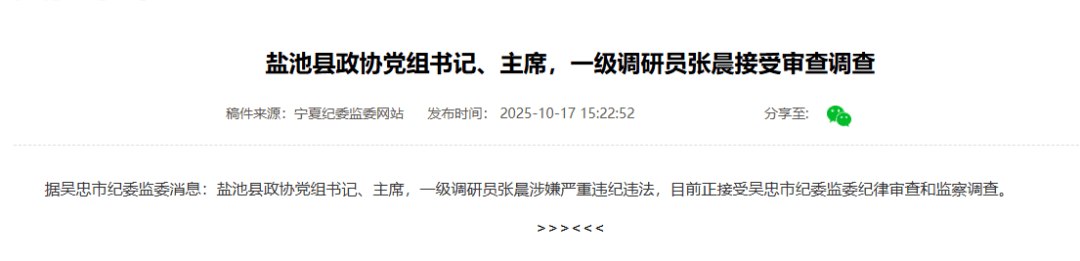 据吴忠市纪委监委消息:盐池县政协党组书记、主席,一级调研员张晨涉嫌严重违纪违法,目前正接受吴忠市纪委监委纪律审查和监察调查。