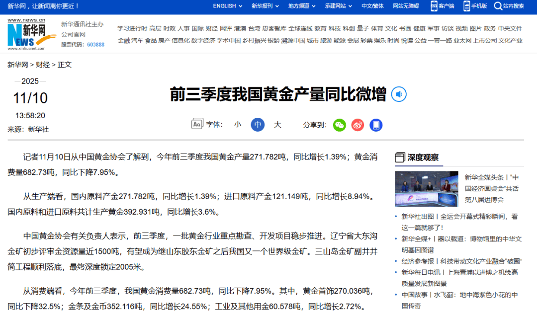 11月11日,央视《朝闻天下》《新闻直播间》等媒体报道“雪龙”号起航后开始首项作业;央视《朝闻天下》、人民网、中国新闻网、中国日报网、中国经济网、《经济日报》6版等媒体报道“十四五”期间茶油产量大幅提高;新华网、《人民日报海外版》等媒体报道前三季度我国黄金产量同比微增。