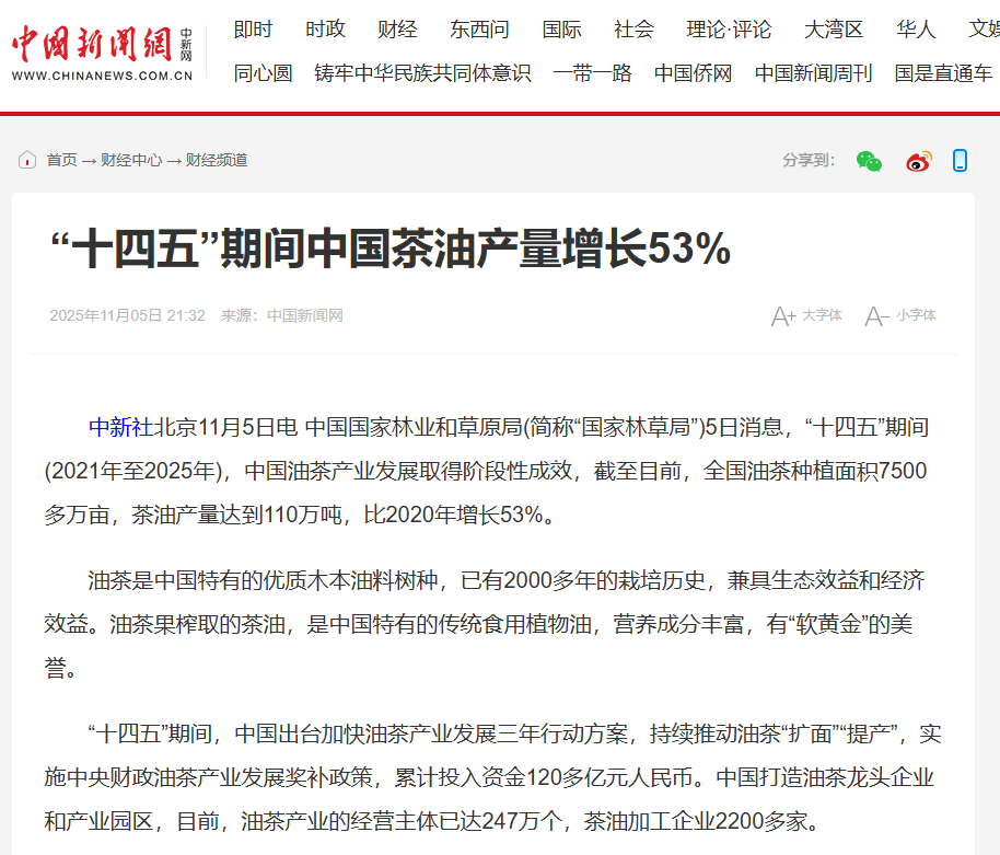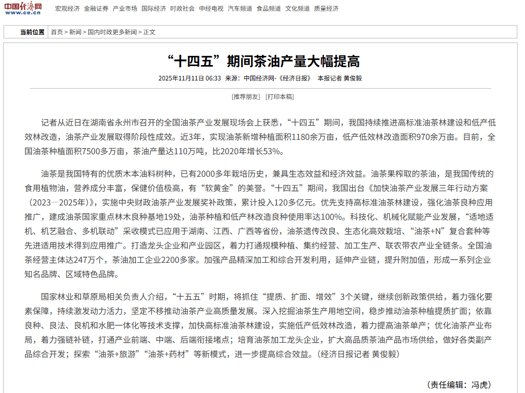 标题:全国油茶种植面积7500多万亩 “十四五”时期茶油产量同比增长53%
