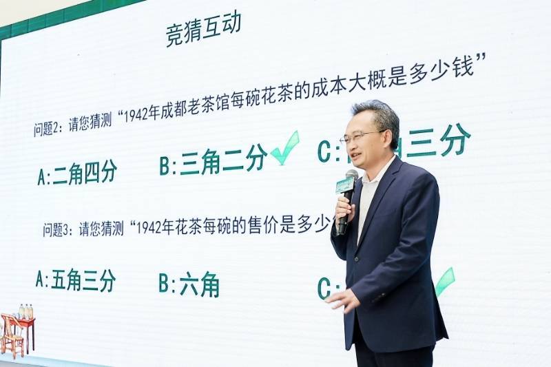活动在精彩的长嘴壶茶艺表演中启幕,灵动的茶艺展示瞬间点燃现场氛围。随后,趣味“数据竞猜”环节接力登场,四川旅游学院院长王川带领观众“猜数量、猜茶价、猜物价”,通过3份档案还原百年前成都老茶馆的市井风貌,从原真性角度为现场观众建立起对老茶馆档案的宏观认知。随后,根据档案内容改编的金钱板唱腔响起,中国国际茶文化研究理事张京与金钱板表演者“一唱一和”,通过2份档案生动演绎老茶馆与市民的鲜活记忆,让“市井里的民生”可感可触,尽显成都老茶馆的“市井韧性”。在“老茶馆与城市发展”的线上互动环节中,四川大学教授李菲以线上征集问题为线索,解读3份档案背后老茶馆与城市的关系,深入剖析老茶馆的“生存智慧”,从学术维度彰显老茶馆档案的研究价值。最后,成都市铜壶茶艺第五代传承人、抖音百万粉丝博主杜德骑通过2份档案,串联起“历史对外交流—当代文化输出—世界文化认可”的发展脉络,生动展现成都老茶馆从“百年前的文化窗口”到“新时代的世界记忆”的传承历程。