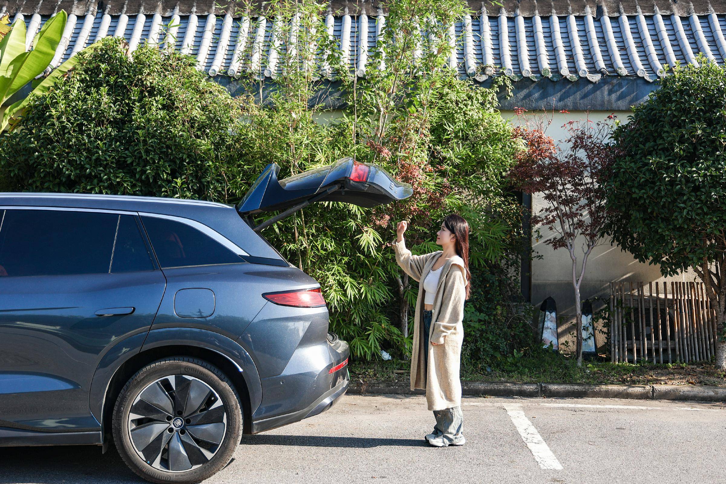 停在庭院巷口时就被惊艳到,墨竹青车身与黛瓦白墙完美相融,路人都忍不住夸 “这车和景太搭了”。打开电动尾门,超大后备箱“储物王者”,整套茶具、折叠茶桌、露营垫轻松塞下,果然名不虚传。